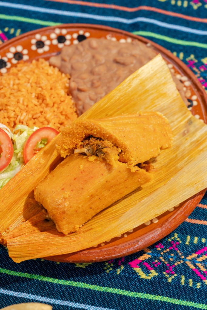Pork Tamale in Salsa Roja wrapped in corn husk.